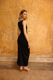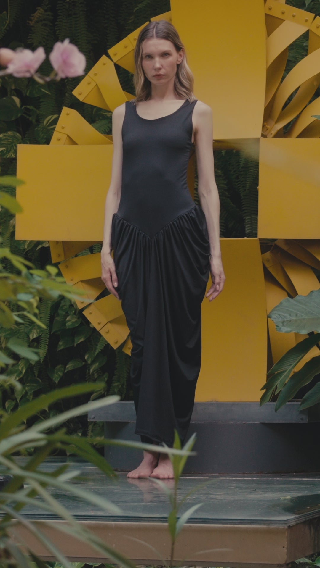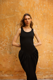 Vestido maxi moderno y escultural, diseñado con una silueta tipo tank y un drapeado dramático en las caderas. Su escote limpio y ajuste ceñido crean una elegancia sin esfuerzo, mientras el fruncido asimétrico aporta movimiento y un toque sofisticado. Minimalista, refinado e impactante.