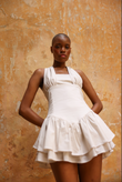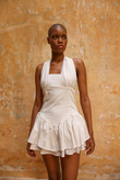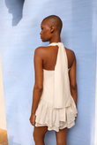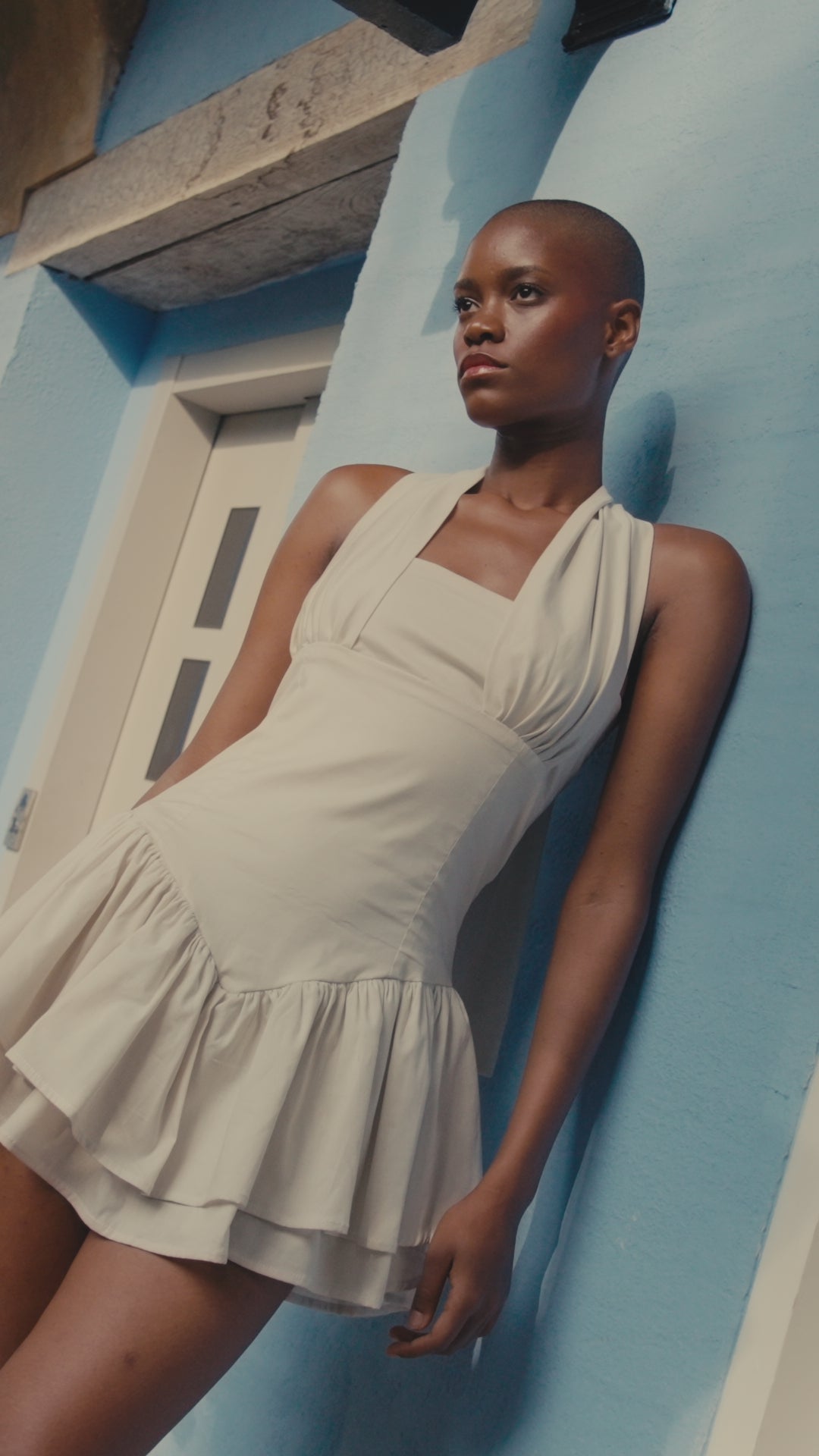 Un vestido mini elegante y juguetón, diseñado con un corpiño estructurado y un escote halter que se anuda con suavidad en la espalda. La falda de volantes en tiernos niveles aporta volumen y movimiento, creando una silueta femenina, fresca y refinada. Ligero, aireado y chic — ideal para días cálidos y momentos resort especiales.