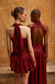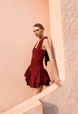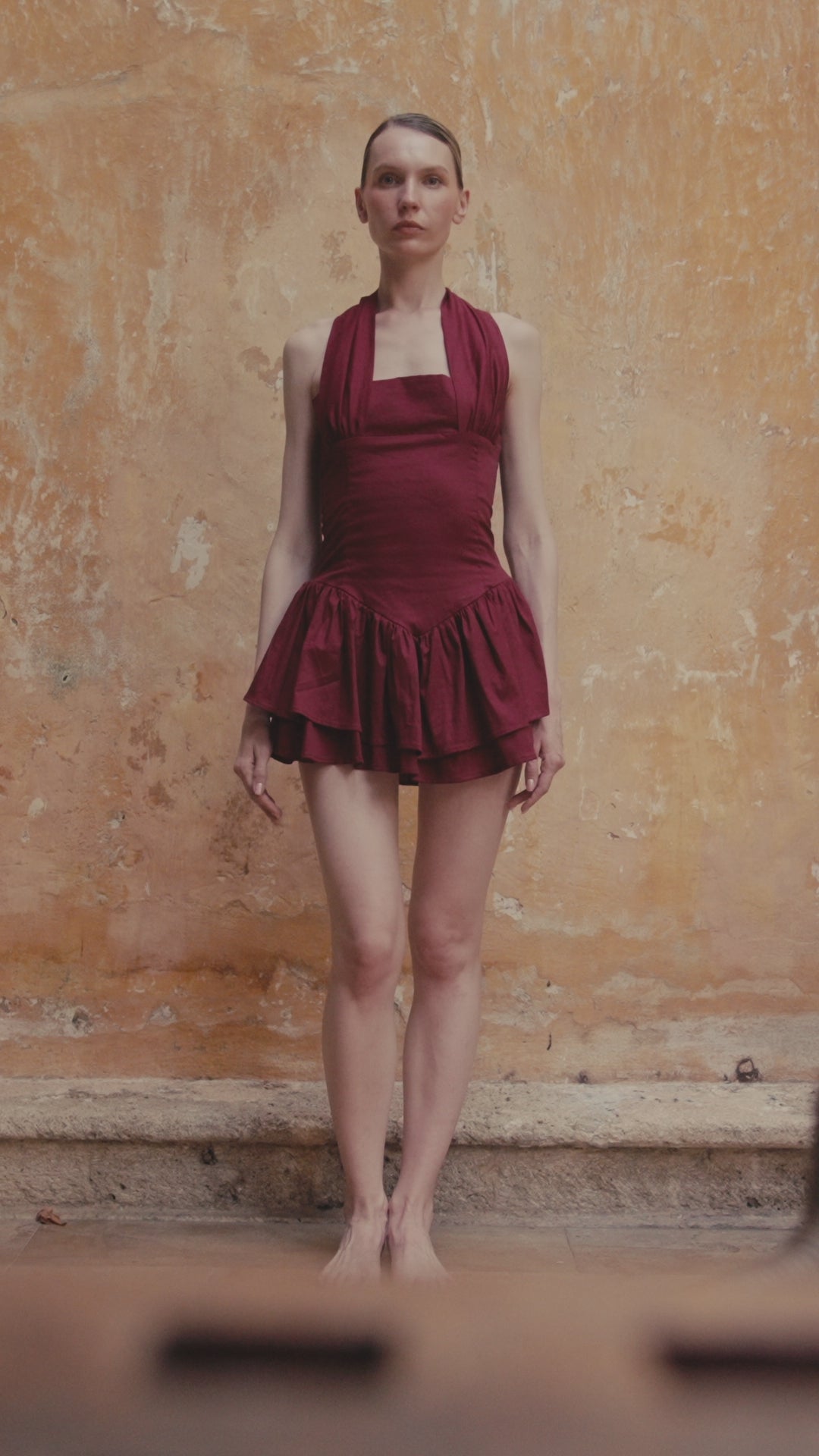 Un vestido mini elegante y juguetón, diseñado con un corpiño estructurado y un escote halter que se anuda con suavidad en la espalda. La falda de volantes en tiernos niveles aporta volumen y movimiento, creando una silueta femenina, fresca y refinada. Ligero, aireado y chic — ideal para días cálidos y momentos resort especiales.