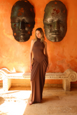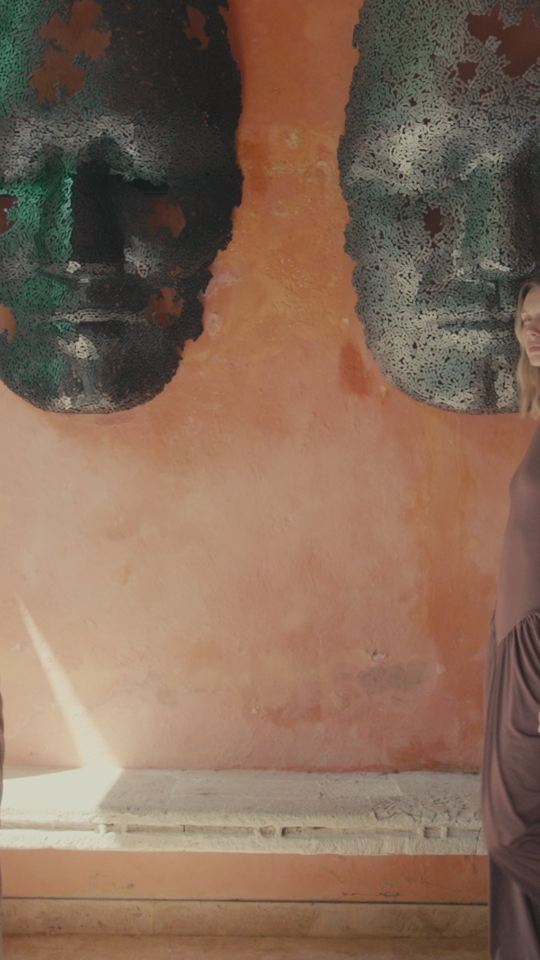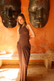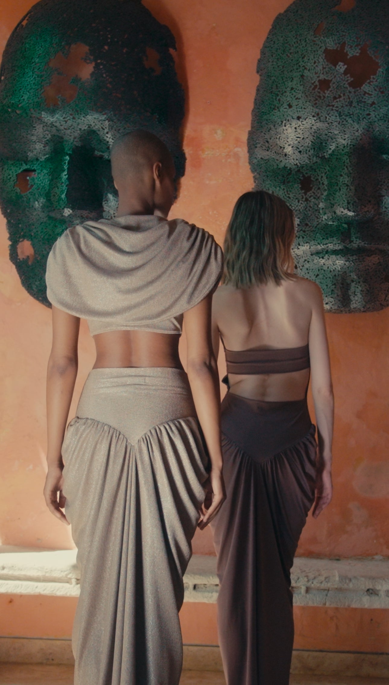 Vestido halter elegante con cuello alto, cuerpo estilizado y frunces en la cadera que realzan la silueta tipo reloj de arena. Su espalda descubierta y falda fluida aportan movimiento y sensualidad natural.