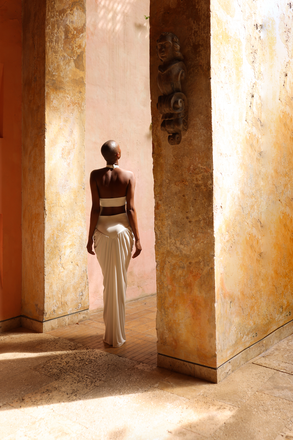 Un vestido maxi de cuello halter con drapeados suaves y esculturales que enmarcan la cintura y caen con elegancia hacia la falda larga. La espalda descubierta aporta un toque moderno y sensual, equilibrando el minimalismo con movimiento. Ligero, refinado y atemporal.