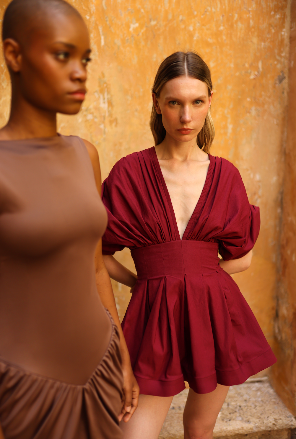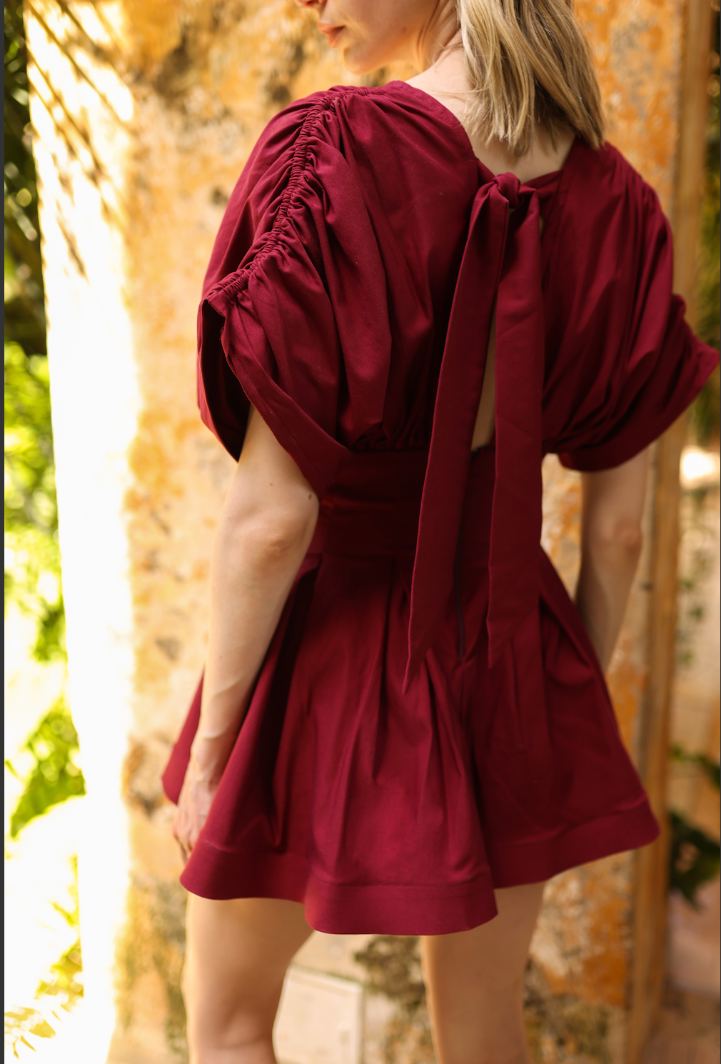 Un vestido mini romántico diseñado con volumen y movimeinto. Presenta un escote profundo en V, mangas recogidas de impacto y una cintura estructura que estiliza la figura. La espalda descubierta se ajusta con un lazo elegante.