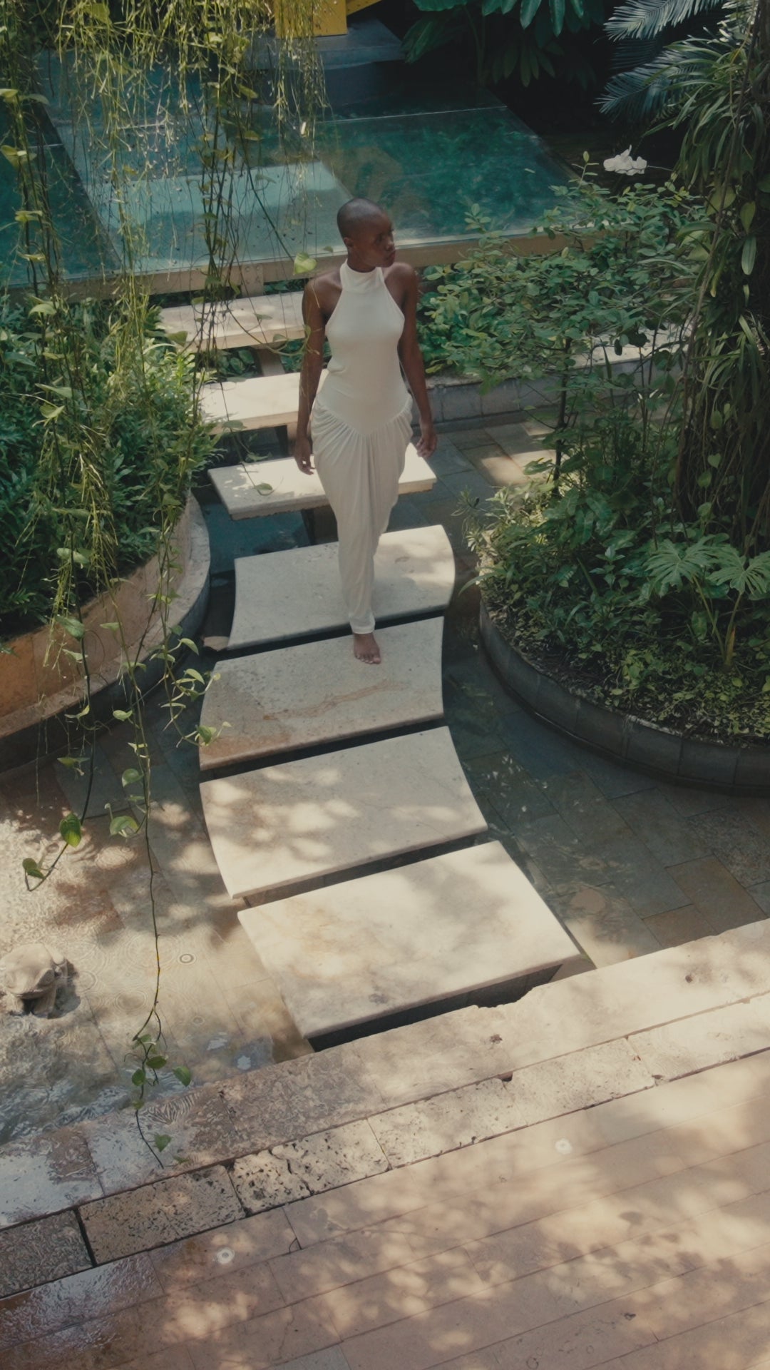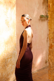 Vestido halter drapeado con escote profundo, nudo frontal y una silueta fluida que abraza el cuerpo.